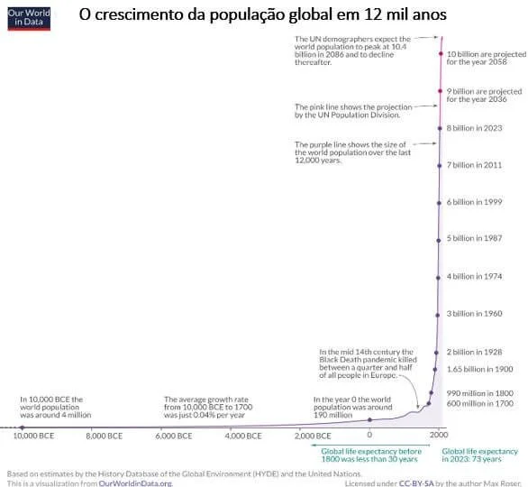 A população mundial cresceu enormemente nos últimos 12 mil anos, tendo um aumento exponencial nos últimos 250 anos. O gráfico abaixo, do site Our World in Data, mostra que a população mundial era de 4 milhões de habitantes há 12 mil anos (3 vezes menos do que a cidade de São Paulo atualmente), atingiu cerca de 1 bilhão de habitantes em 1800, alcançou 4 bilhões em 1974 e 8 bilhões em 2022, devendo chegara 10 bilhões por volta de 2080 e, em seguida, iniciando uma tendência de decrescimento.
