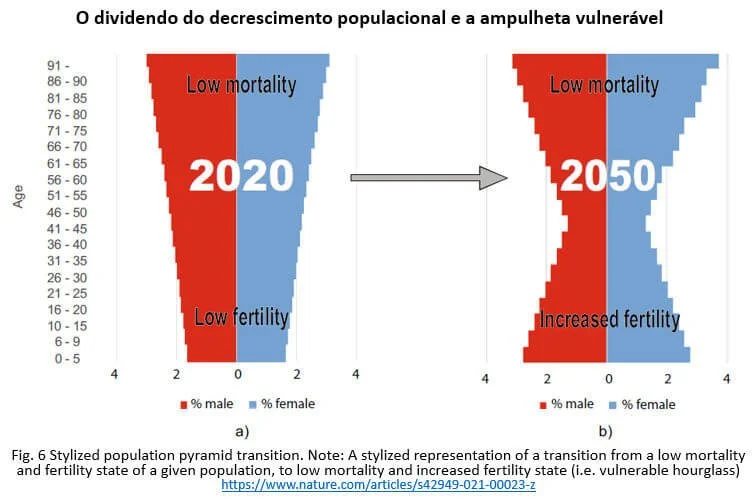 Adicionalmente, os autores mostram que uma política pronatalista para se contrapor ao decrescimento populacional pode dificultar o enfrentamento das questões sociais e ambientais. O lado esquerdo da figura abaixo, representa um 4º bônus demográfico, ou “dividendo do decrescimento”, enquanto o lado direito representa a “ampulheta vulnerável”, que é uma situação de aumento da razão de dependência demográfica, com baixa proporção de pessoas em idade ativa e alta proporção de dependentes, jovens e idosos.